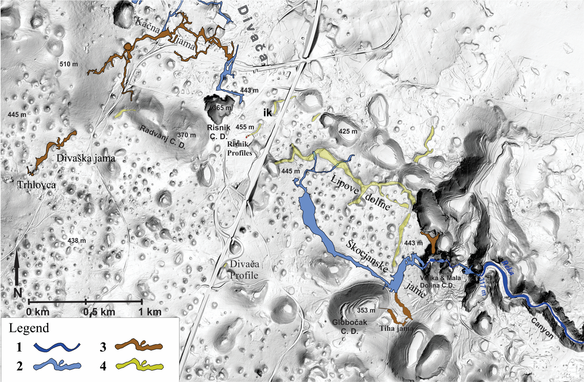 Locations of major relict and active caves with studied sediment sites (based on published and unpublished results; based on Zupan Hajna et al., 2024) shown on a hill-shaded DEM of the Divača Karst. Legend: 1. Surface river; 2. Underground river cave passages; 3. Dry cave passages; 4. Unroofed caves.