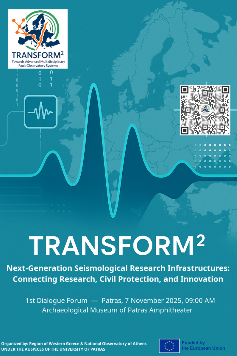 29 May 2025 – co-authorship of presentation entitled “EU funding to integrate cutting-edge methodological and technological solutions, enabling the development of a next-generation network of Near Fault Observatories across Europe (project TRANSFORM²)“, was presented at GSG 2025: 17TH INTERNATIONAL CONGRESS OF THE GEOLOGICAL SOCIETY OF GREECE - https://easychair.org/smart-program/GSG2025/2025-05-29.html#talk:281373